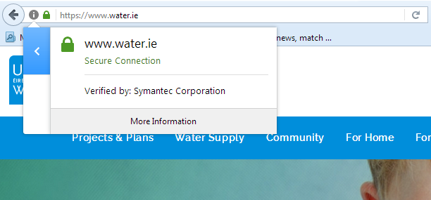 All pages on www.water.ie are encrypted. You can verify a page address by looking for https:// and the padlock icon in your browser. The padlock icon will display more information about the connection you are using and ensure it is secure.