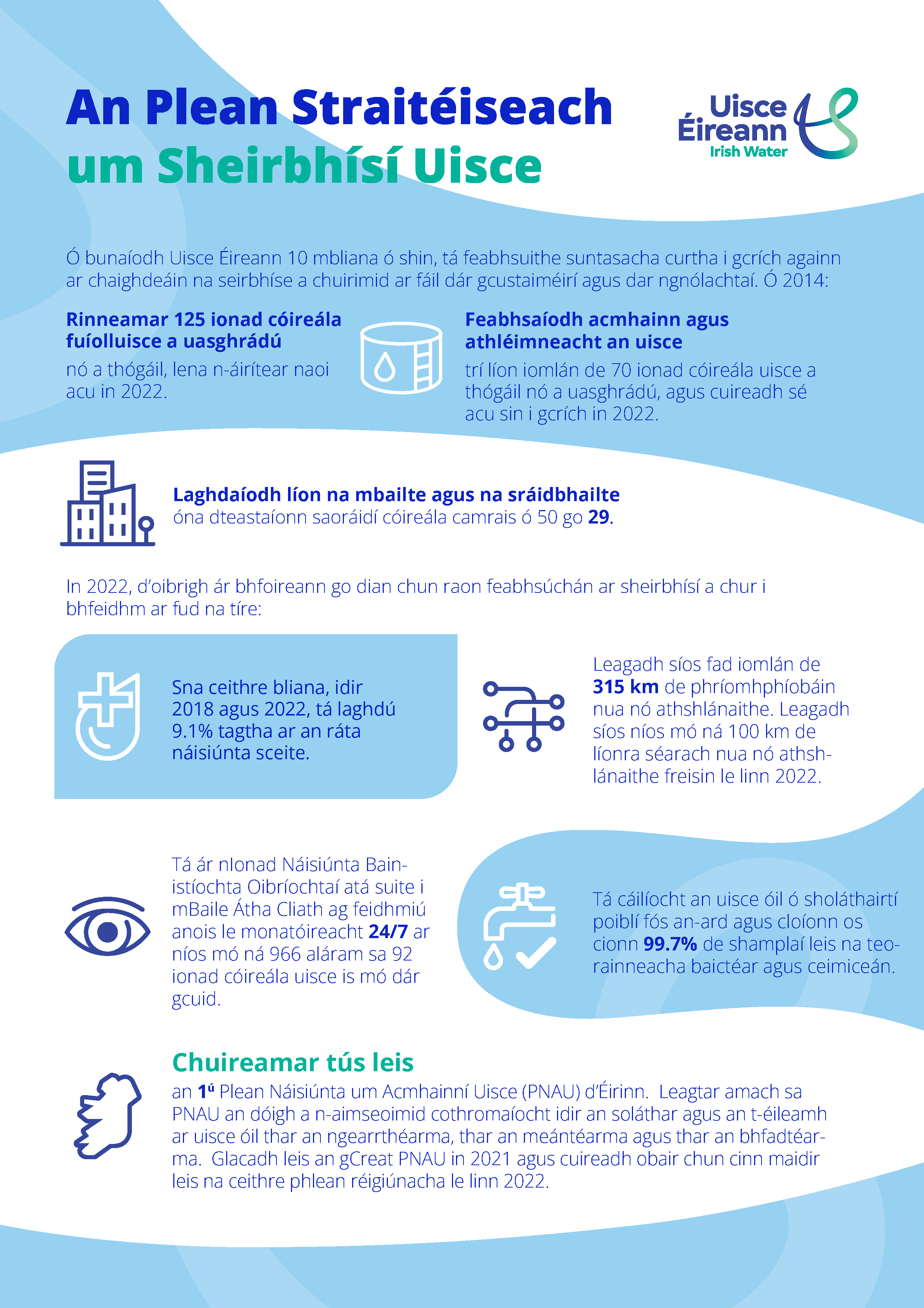 Leis an bPlean Straitéiseach um Sheirbhísí Uisce (PSSU) cuirtear cuspóirí Uisce Éireann i láthair do na 25 bliana atá romhainn mar aon leis na bealaí ar a mbainfimid amach iad. Tá sé ar chomhréim leis na ceanglais atá leagtha amach san Acht um Sheirbhísí Uisce (Uimh. 2), 2013. D’fhoilsíomar ár gcéad Phlean Straitéiseach um Sheirbhísí Uisce in 2015 agus anois táimid ag dul i mbun an phróisis chun comhairliúchán a dhéanamh maidir le dréacht-Phlean Straitéiseach um Sheirbhísí Uisce 2050 (PSSU 2050) a chuirfear in ionad an phlean reatha.