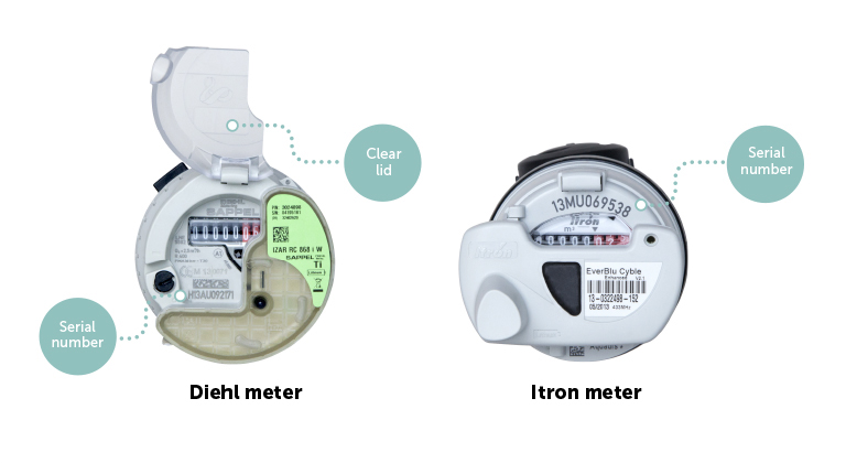 There are two types of water meters, Diehl and Itron. The images below show the location of the serial number on each of these meters.