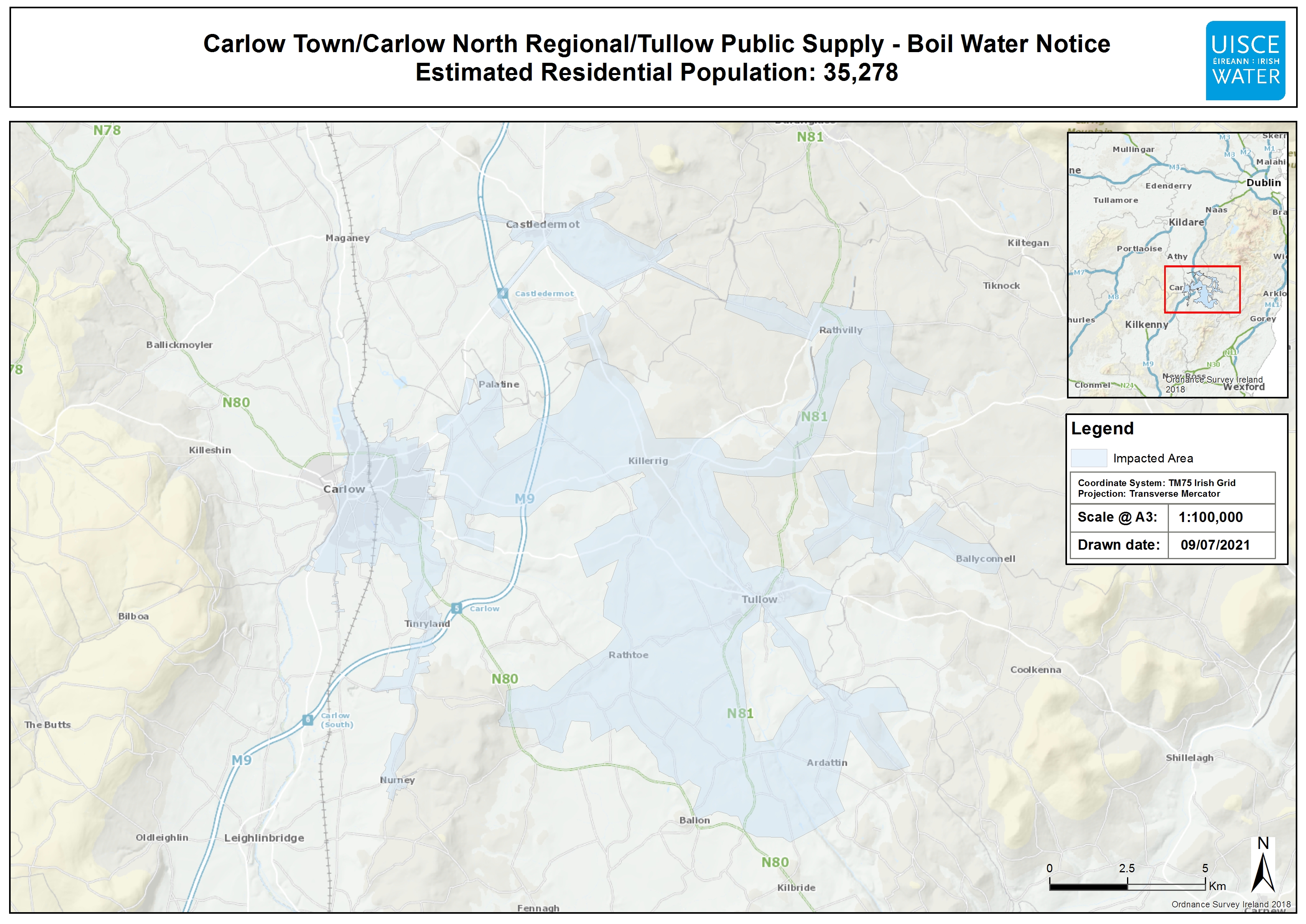 All customers supplied by the Carlow North Regional PWS, Tullow PWS and Carlow Town PWS (Graigcullen not impacted), which includes the following areas: