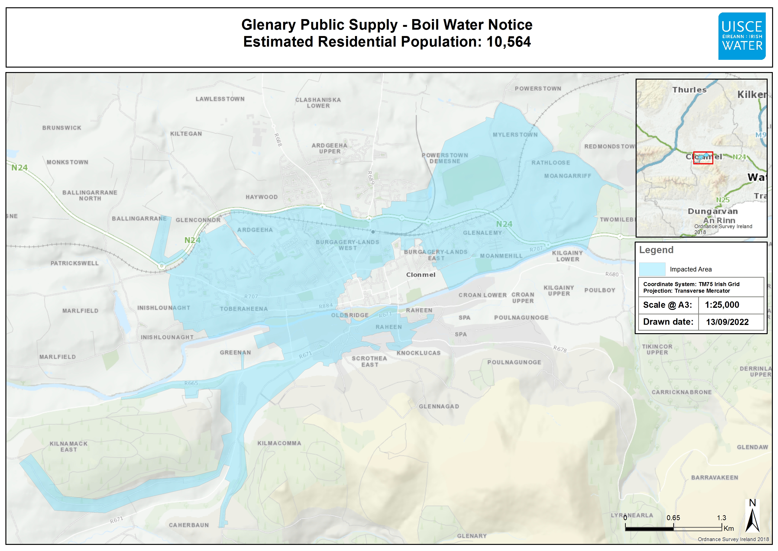 Uisce Éireann and Tipperary County Council wish to remind customers supplied by the Glenary Public Water Supply, that the Boil Water Notice issued on 13 September remains in place.