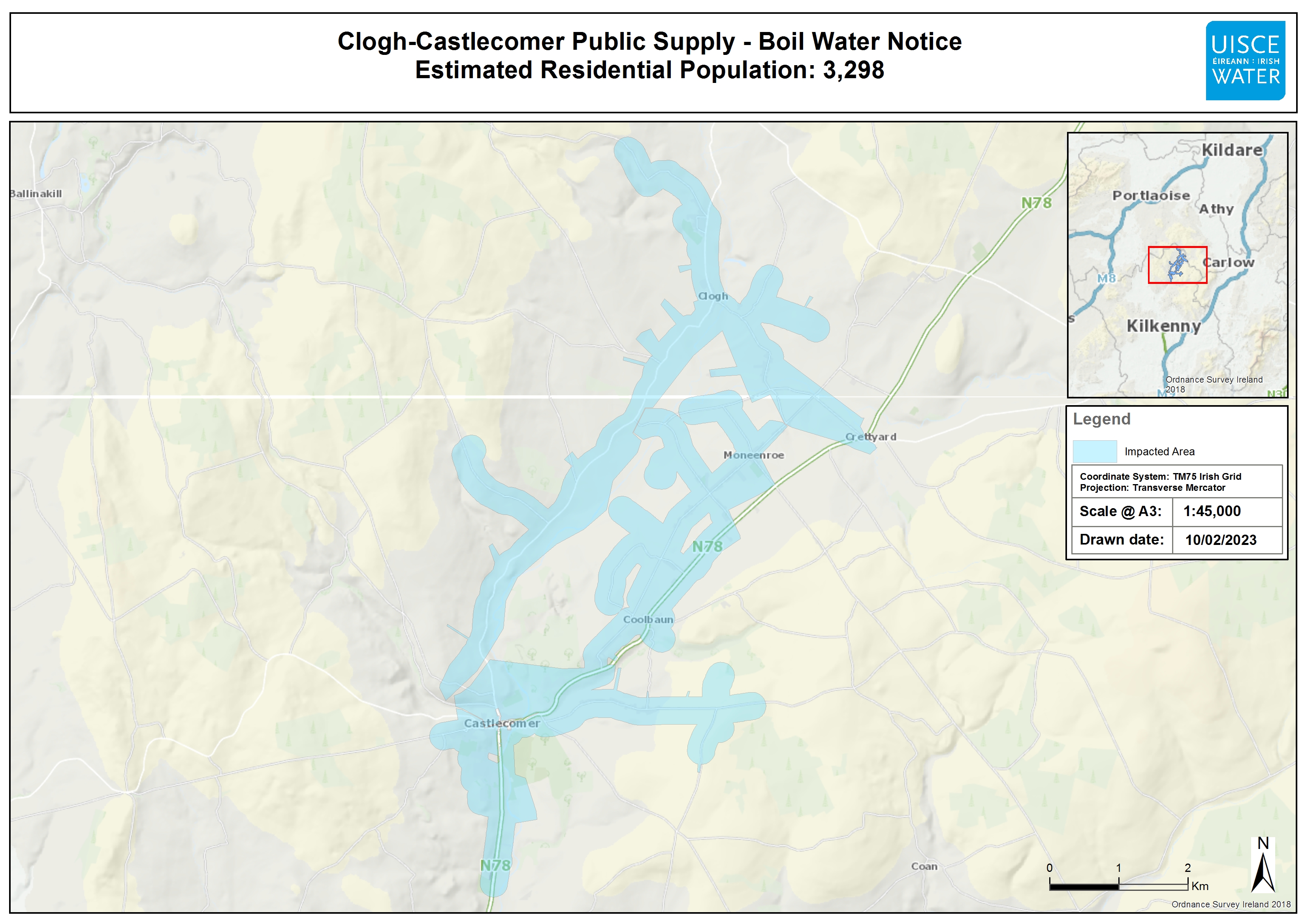 Areas impacted include Clogh, Moneenroe, Castlecomer and surrounding areas. Customers can check if their property is included by visiting the Water Quality section and entering the property's Eircode or by calling the Uisce Éireann's customer care helpline, open 24/7, on 1800 278 278. A map of the area is attached and available to view on the supply and service section of water.ie.