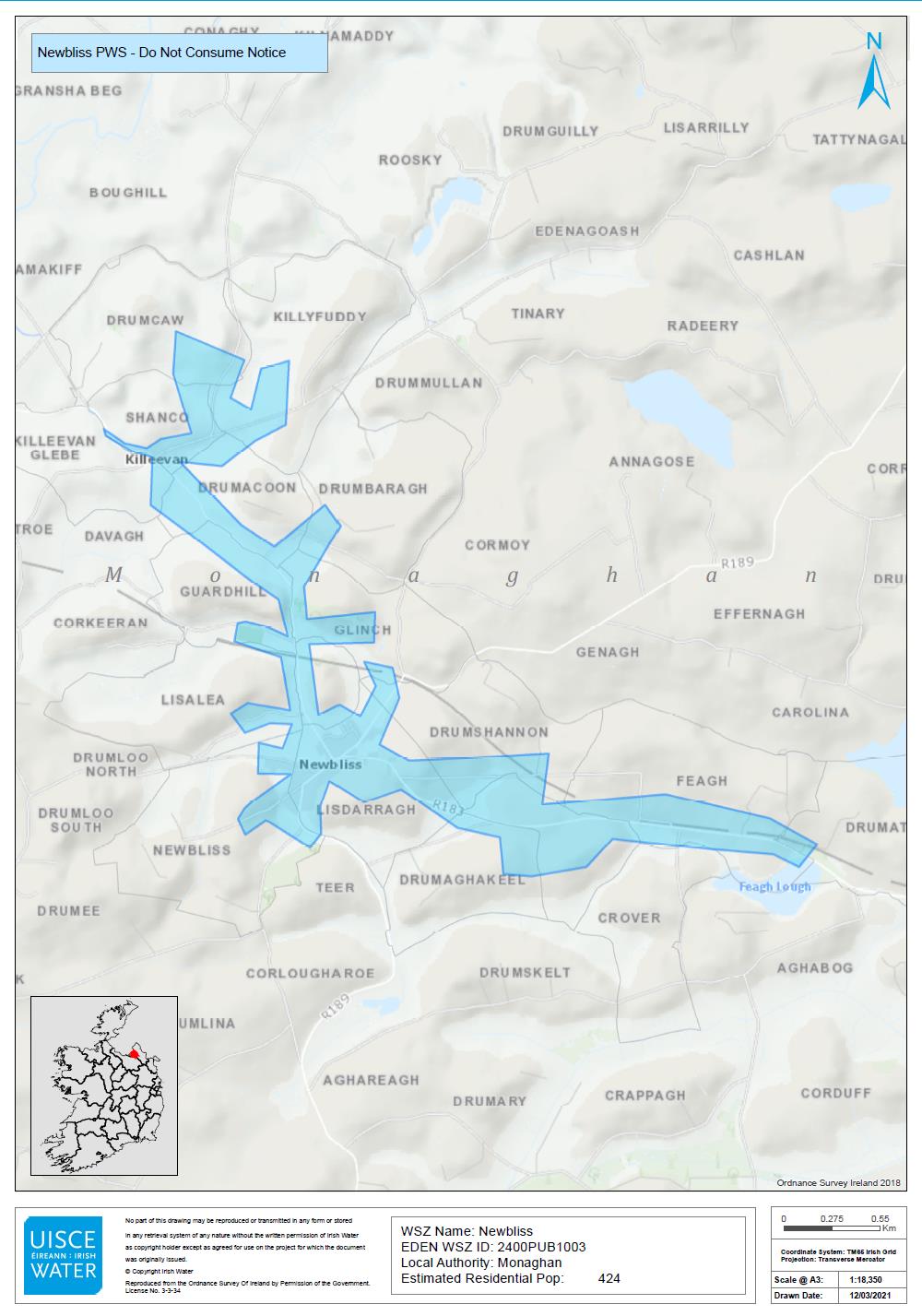 Following consultation with the Health Service Executive (HSE), Uisce Éireann and Monaghan County Council issued a Do Not Consume Notice for all consumers on the Newbliss Public Water Supply Scheme due to elevated levels of manganese and iron. The Do Not Consume Notice remains in place pending the completion of remedial works and receipt of satisfactory monitoring results. The notice applies to over 400 customers supplied by the Newbliss Public Water Supply Scheme.