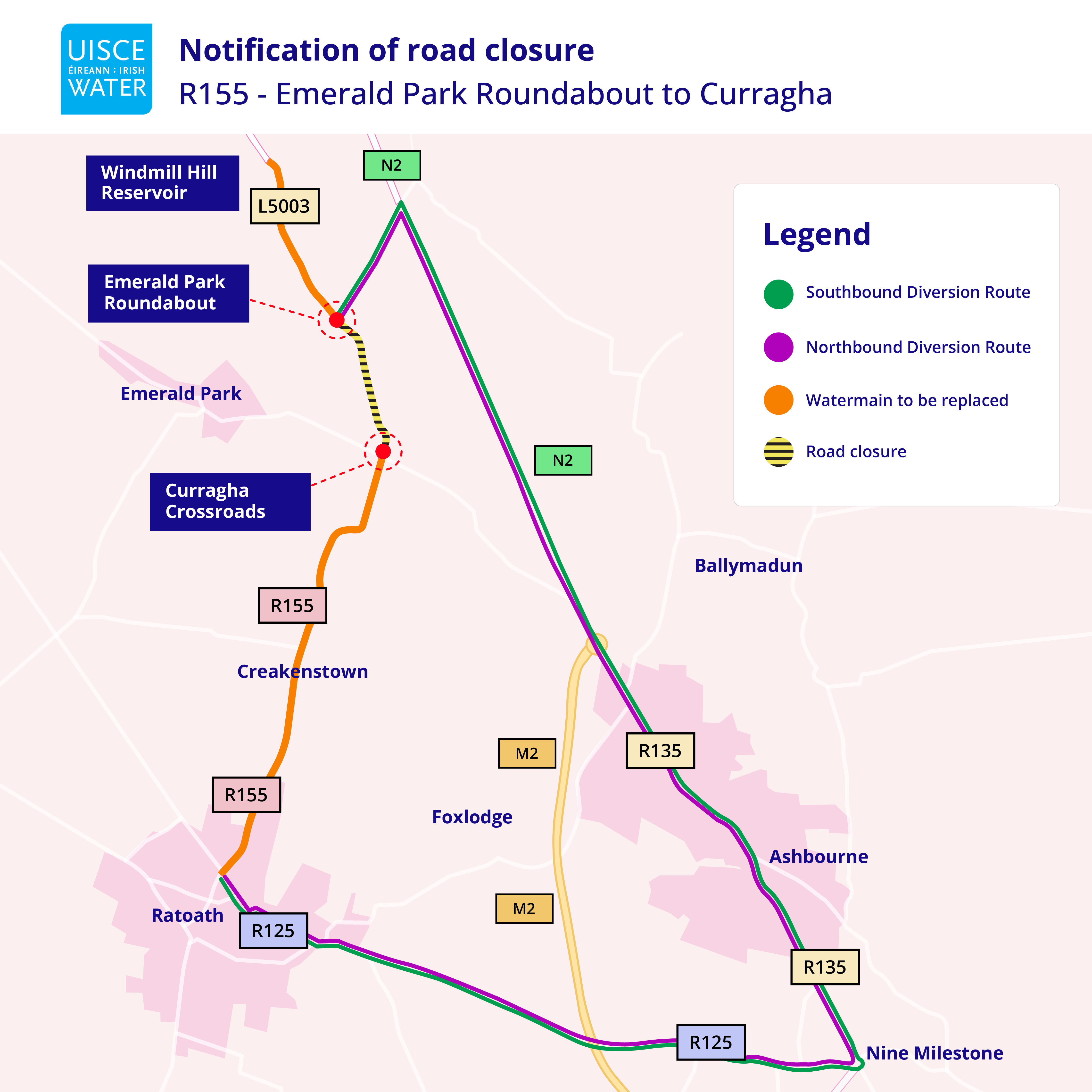 During this period a signed traffic diversion route from the R155/Skryne road junction to the Emerald Park roundabout will exist via Ashbourne. Local and emergency access will be maintained throughout the works for all residents and businesses.