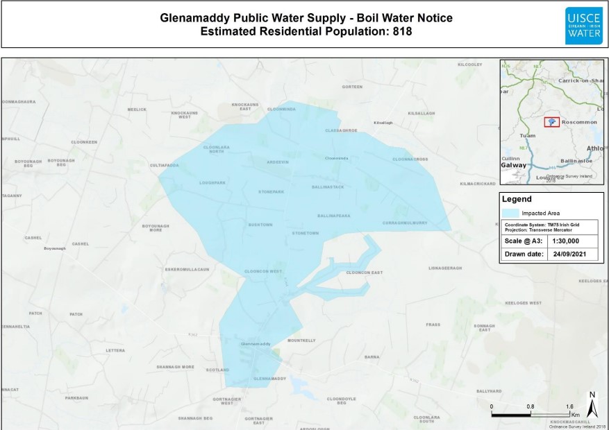 Following consultation with the Health Service Executive, Uisce Éireann and Galway County Council are issuing a Boil Water Notice with immediate effect to protect the health of consumers supplied by Glenamaddy Public Water Supply in the areas of Glenamaddy, Cloonminda, Bushtown and the Knockmascahill Group Water Scheme. A map of the extents of the area is attached.