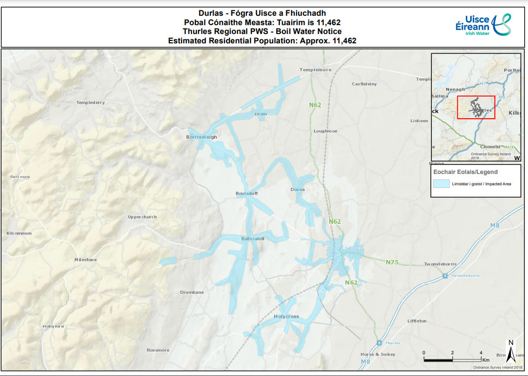 The population impacted by this notice is approximately 11,398 people. This notice is being issued due to disinfection issues in the network. The areas affected include customers in Hollycross, Thurles, Ballycahill, Bouladuff, Dovea, Borrisoleigh and Drom and surrounding areas.