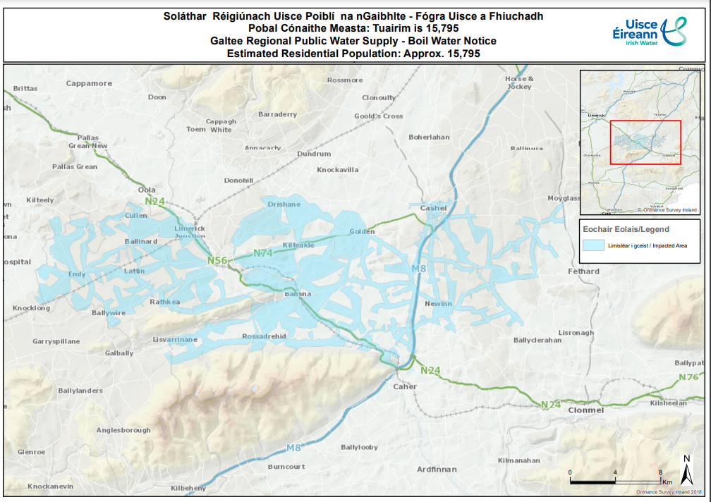 The notice impacts all areas on the Galtee Regional Public Water Supply including Emly, Lattin, Ballinard, Cullen, Ballywire, Kilross, Limerick Junction, Monard, Lisvarnane, Rosadrehid, Bansha, Tankerstown, Kilfeacle, Golden, Cashel, Rosegreen, New Inn and surrounding areas.