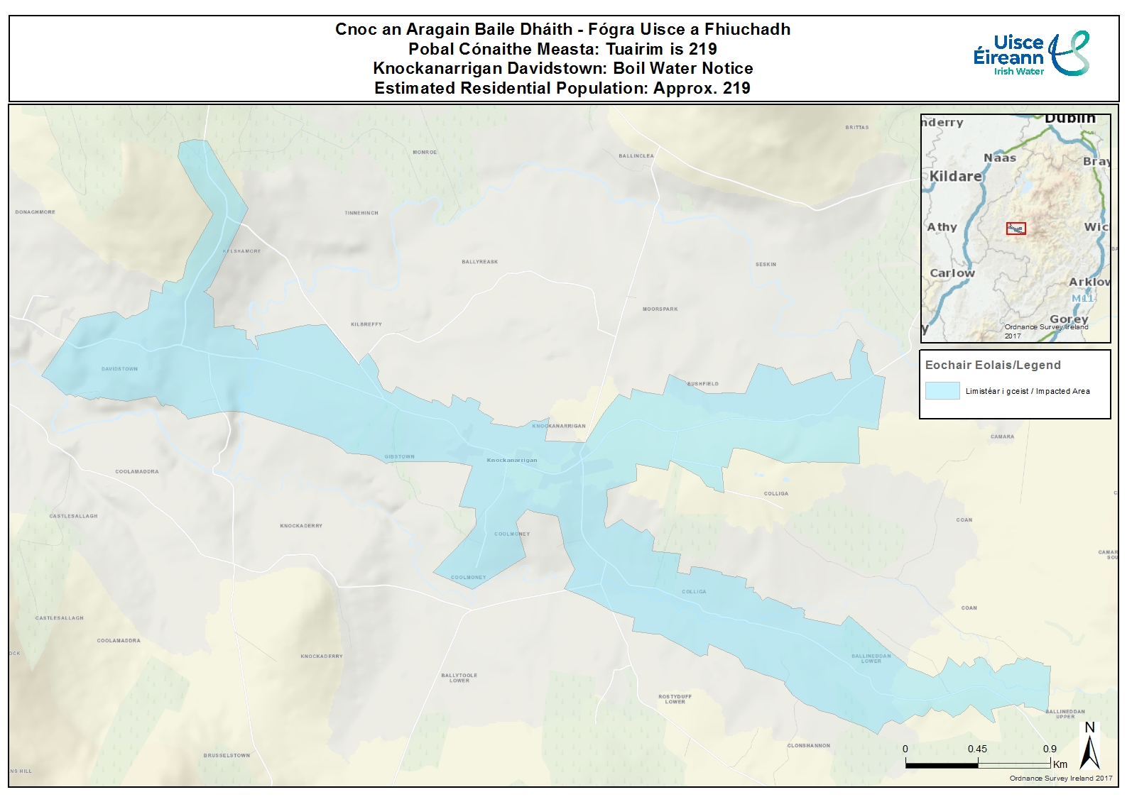 Uisce Éireann, in partnership with Wicklow County Council, continues to progress works to lift the Boil Water Notice in place to protect the health of approximately 219 customers supplied by the Knockanarrigan Davidstown Public Water Supply. The notice is in place due to the detection of E.coli, enterococci, and coliforms in samples collected in the supply.