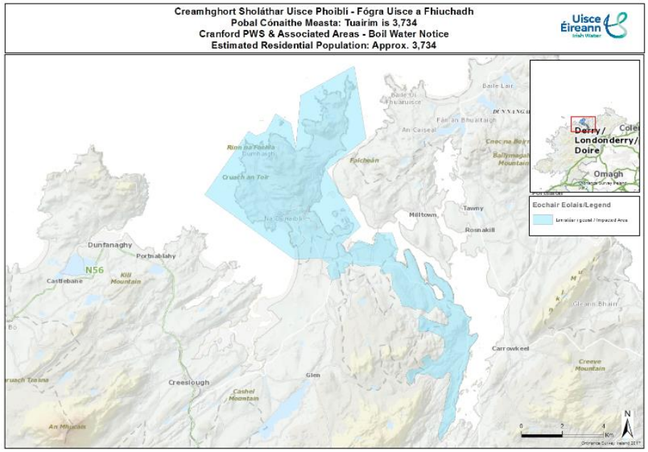The population impacted by this notice is approximately 3,734 people. This notice is being issued due to disinfection process issues at Cranford Water Treatment Plant. The areas affected include customers in Cranford (The Bogue) no. 2 Group Water Scheme (GWS), Carrick Upper GWS, Isle of Roy GWS, the Rosguill Peninsula including Grainne Hill, Dooey, Dundoan, Crocknamuirleog, Derryhasson GWS and surrounding areas.