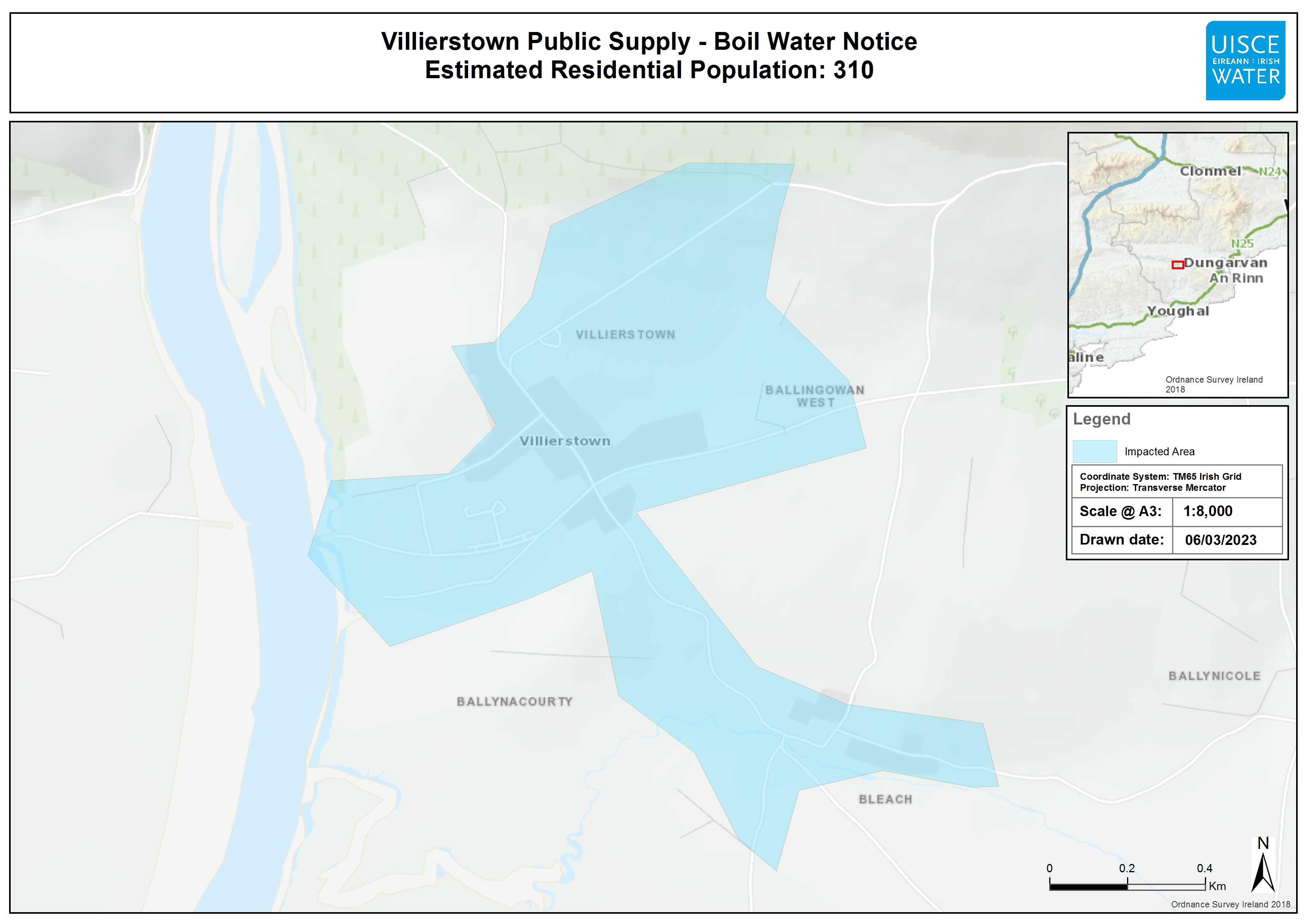 The notice impacts customers in Villierstown and surrounding areas. A map of the area is attached and available to view on the Supply and Service Updates section of our website. Customers can also check if their property is included by visiting the Water Quality section of our website and entering the property's Eircode or by calling the Uisce Éireann's customer care helpline, open 24/7, on 1800 278 278.