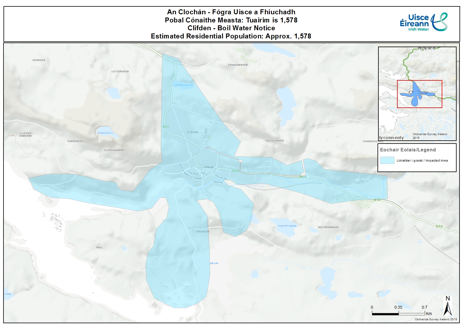 Areas impacted include Clifden and surrounding areas. Customers can check if their property is included by visiting the Water Quality section of www.water.ie and entering the property's Eircode or by calling the Uisce Éireann customer care helpline, open 24/7, on 1800 278 278.