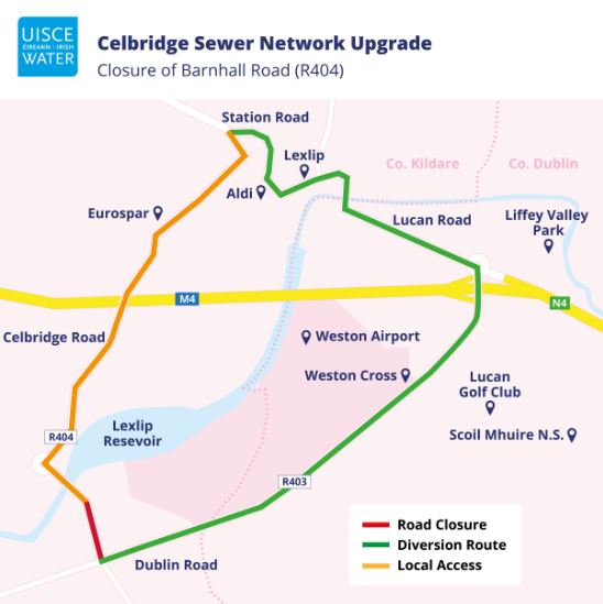 In order to continue to progress this essential project two separate road closures will be required in the coming weeks. Road Closure 1 will commence in the early hours of Monday, 3 April and will impact the Barnhall Road (R404). To safely carry out the works at Youngs Cross Junction, a road closure will be necessary on the Barnhall Road (R404) with diversions in place via the R403 (Dublin Road) & Lucan Road. Please view map attached of the diversions. Local access will be maintained for local residents, businesses and emergency services for the duration of works. Details of the traffic management plan have also been communicated locally and Uisce Éireann expects this section of works to be completed the evening of Friday, April 7, 2023.